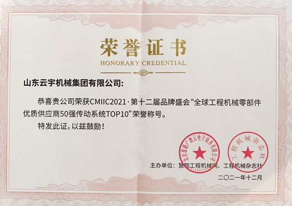 在本屆大會上,山東云宇憑借良好的產品質量和創新優勢斬獲2021年度全球工程機械零部件優質供應商50強。